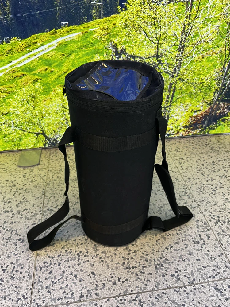 Přepravní brašna, tvar válec s popruhy do ruky i přes rameno, vyztužená.